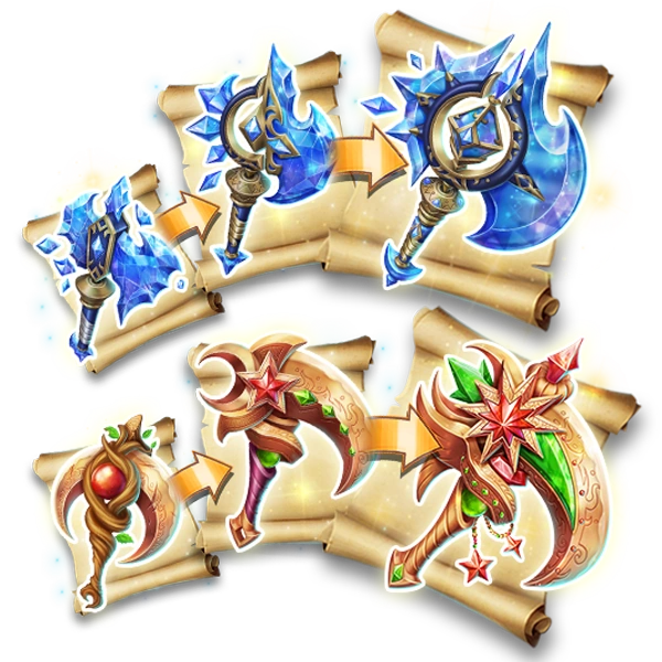 Challenger's Hatchet Dominator's Reaver Tactician's Splitter Frenzy Axe Devastating Sunder Ruinous Tusk Challenger's Spear Dominator's Impaler Tactician's Voulge Frenzy Tip Devastating Pike Ruinous Lance |